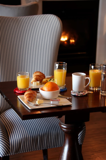 I adore eating breakfast out. Seriously, I'd rather eat breakfast in a restaurant than any other meal. And this restaurant had comfy chairs, down throw pillows, and a cozy fire going in the fireplace...score! Settled in for a leisurely breakfast.