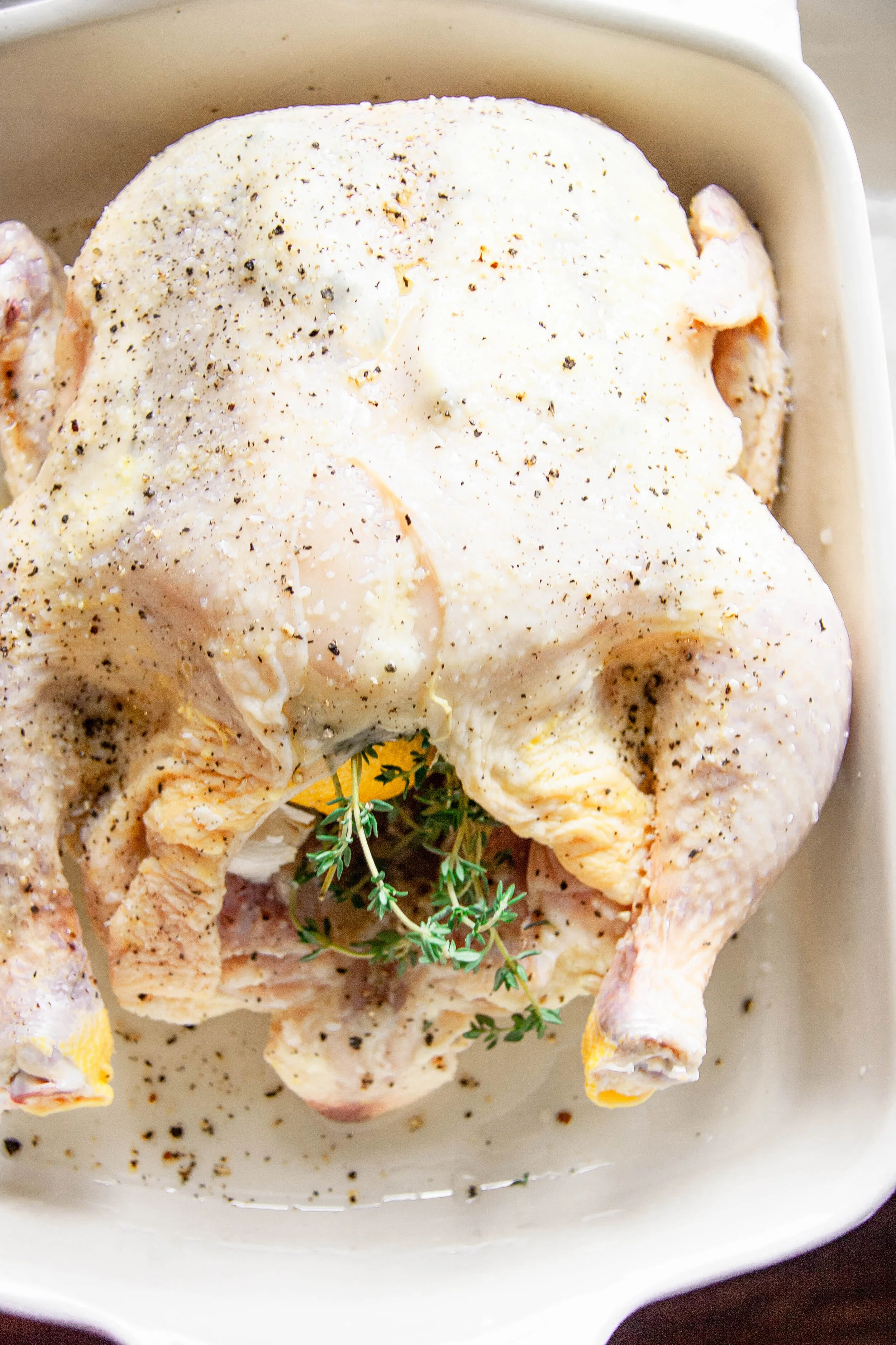 Toss squeezed lemon halves, unpeeled garlic, and thyme sprigs into the chicken cavity.