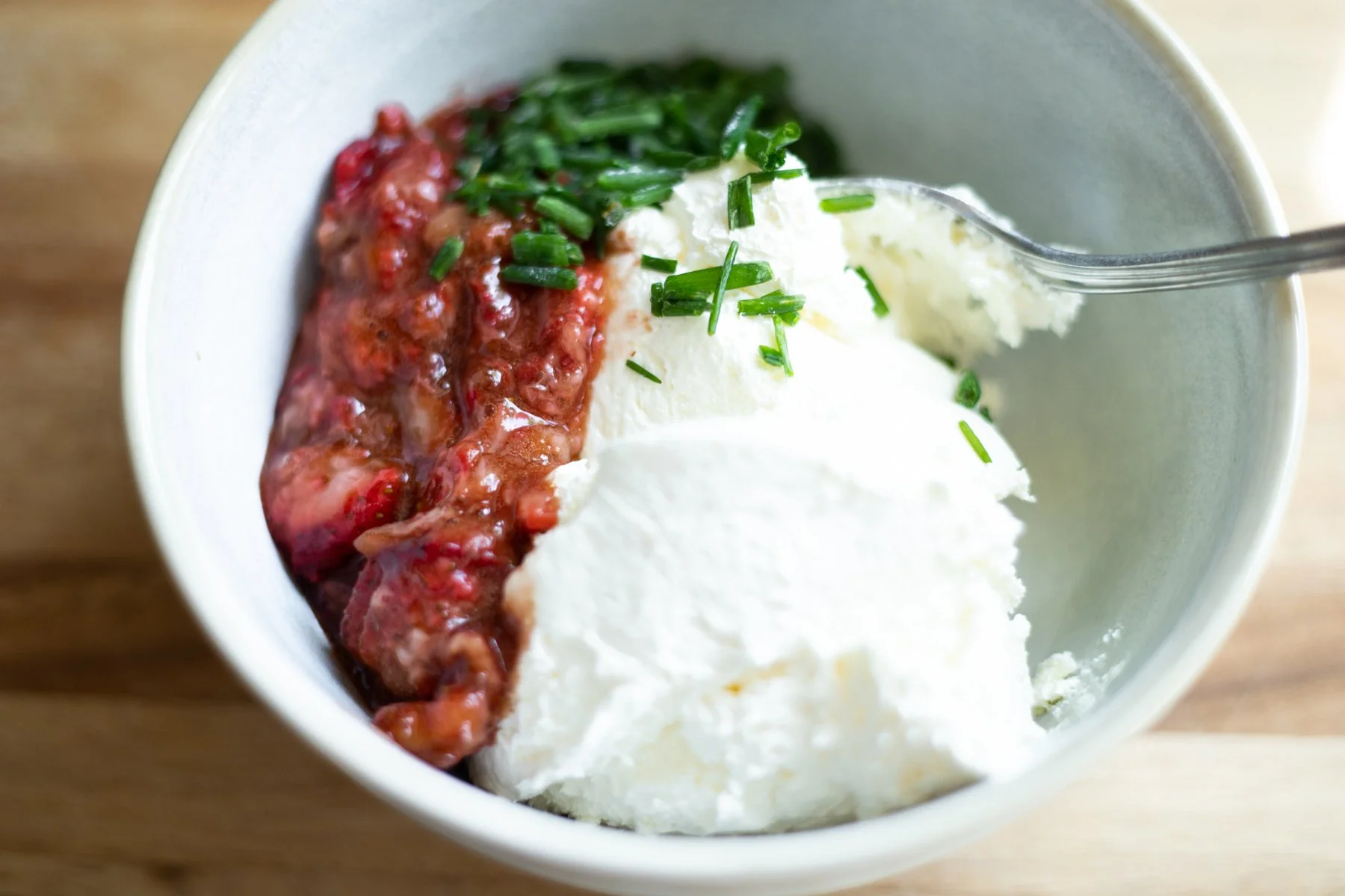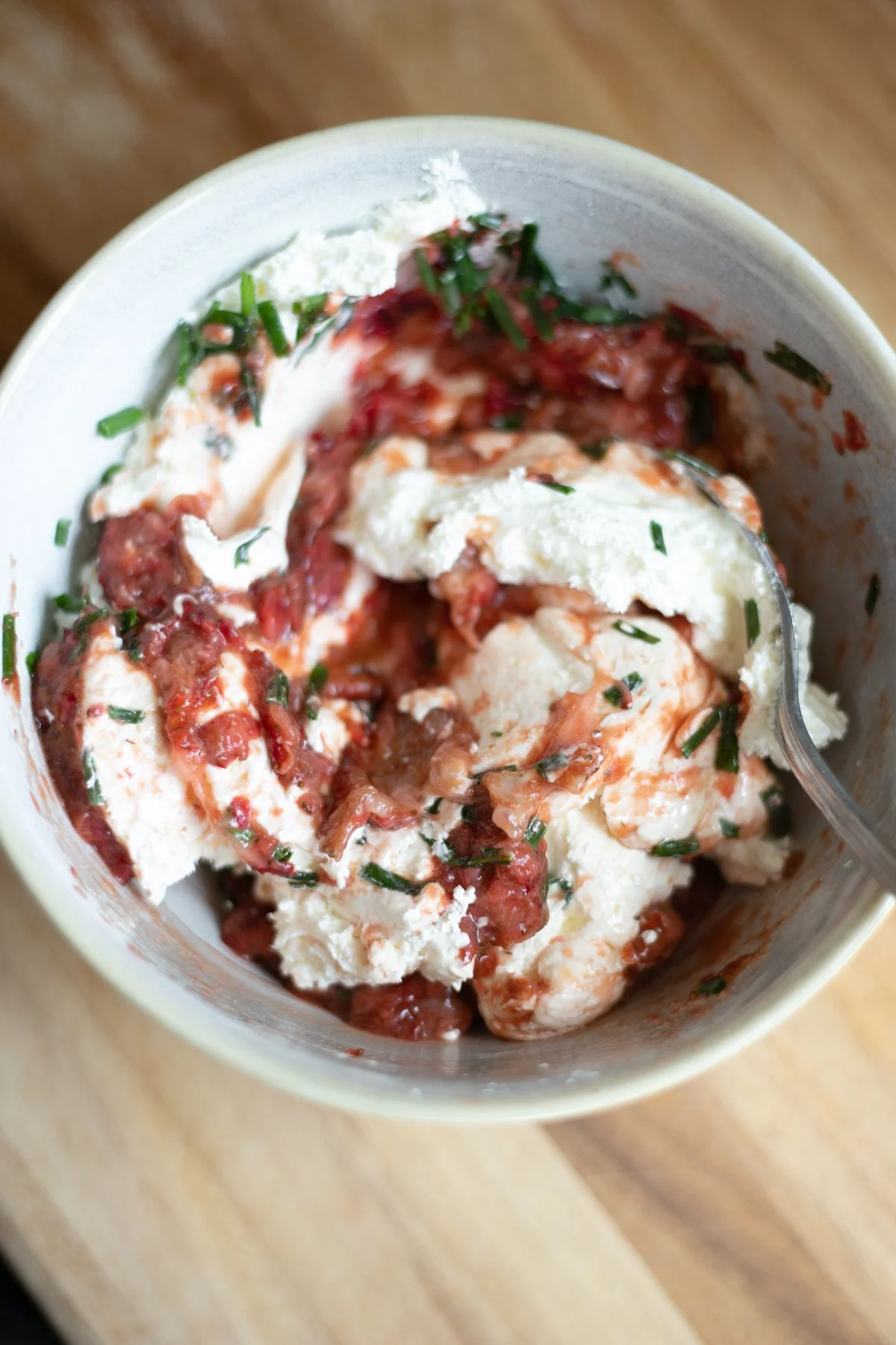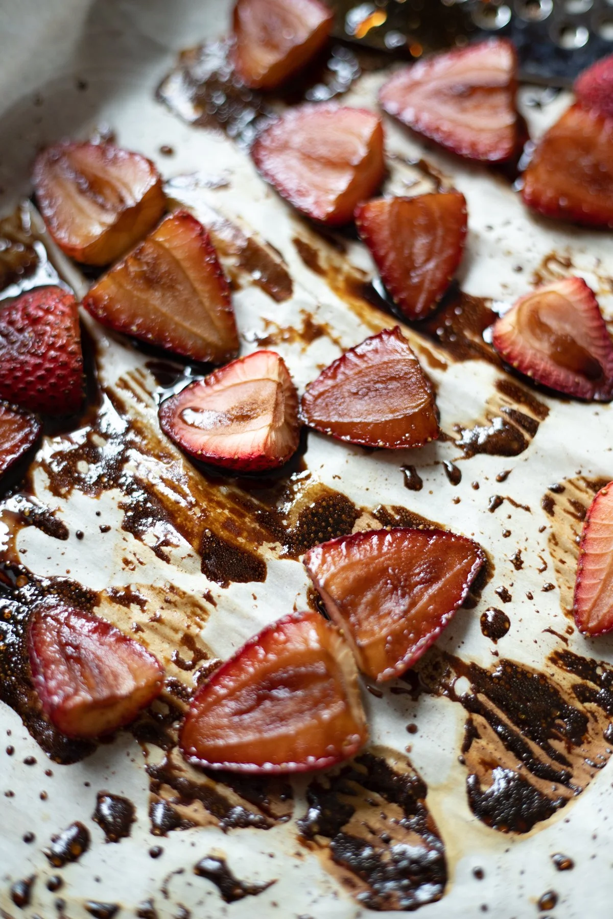 Roasting the strawberries is so simple! Arrange them in a single layer on a parchment-lined baking sheet and drizzle with maple syrup and balsamic vinegar…add a pinch of salt. Then roast in a 350 oven for 25-30 minutes, flipping them over once while cooking. Cool slightly, then mash with a potato masher. Cool completely.