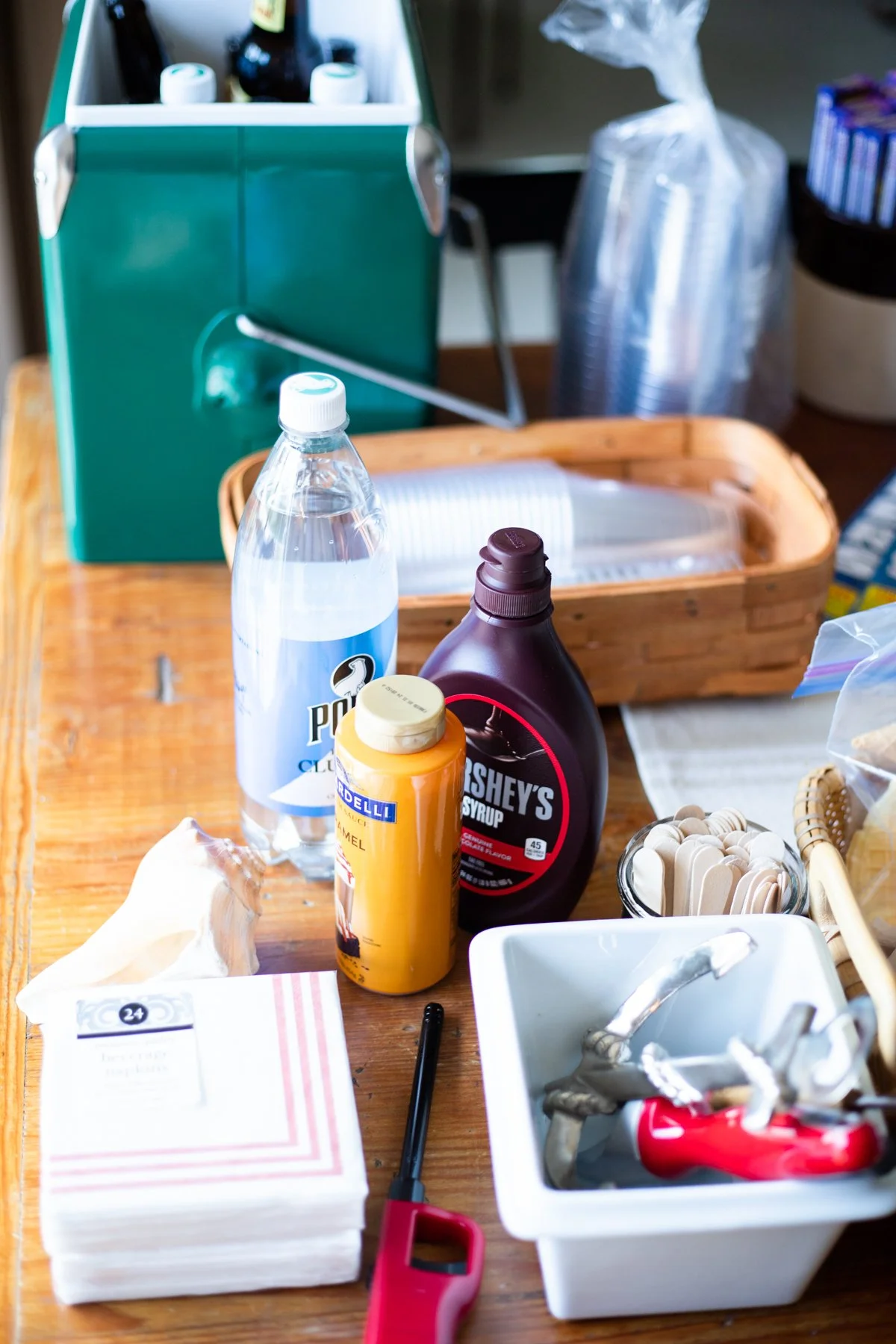 We did all the outside set-up early in the morning. And I used my kitchen table as a staging area for all the rest of the supplies. I unboxed all the cones, but sealed them up in bags to keep them fresh. This turned out to be a lifesaver when the party had just barely begun and it started to rain. Planning everything but the weather! (Thankfully, the rain only lasted about 10 minutes.)